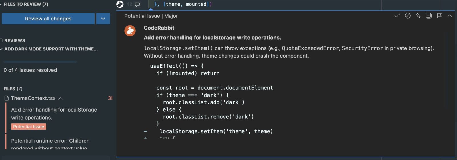 CodeRabbit for VSCodeの最大の魅力は、開発中にリアルタイムでフィードバックを受けられるという点です。PR段階でのレビューと併用することで、より強固なコード品質管理体制を構築できます。